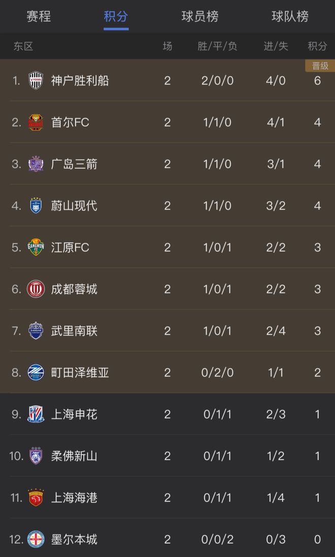 2轮战罢,成都蓉城1胜1负积3分,排名并列第5位。而申花和海港都是1平1负积1分,暂时处于淘汰区。